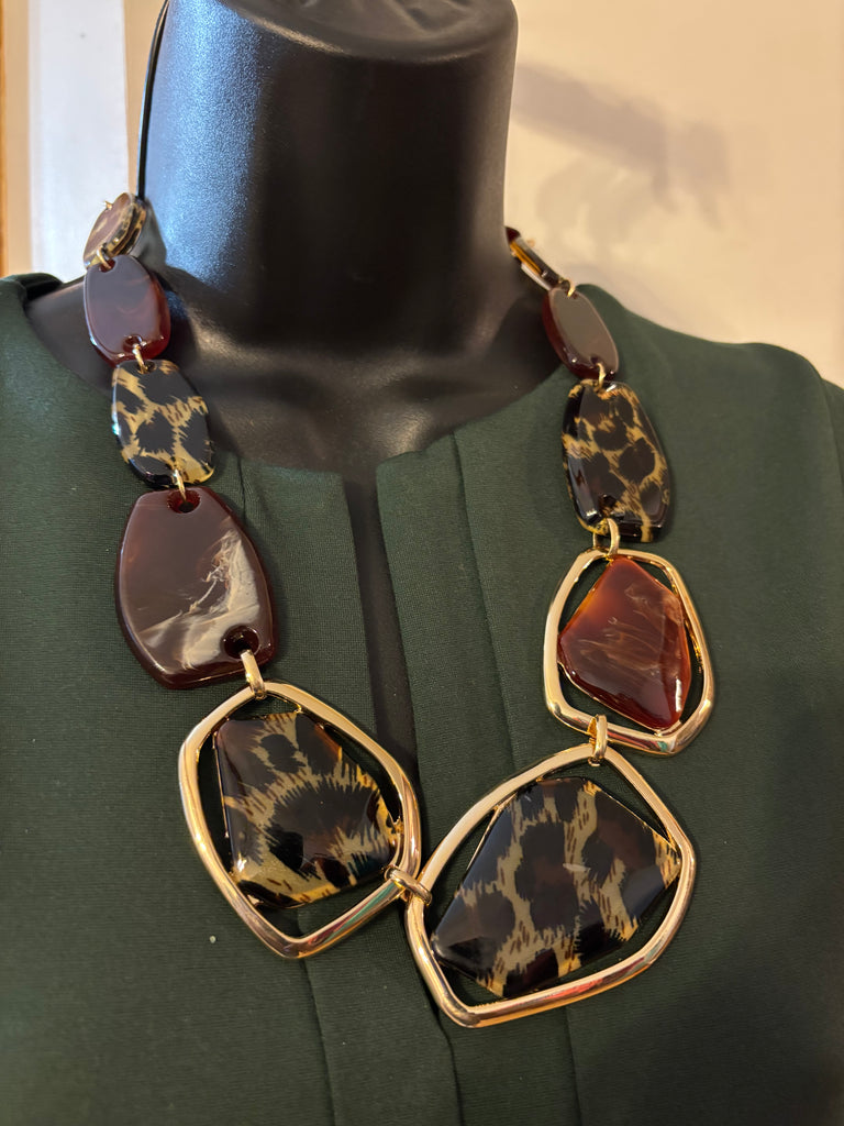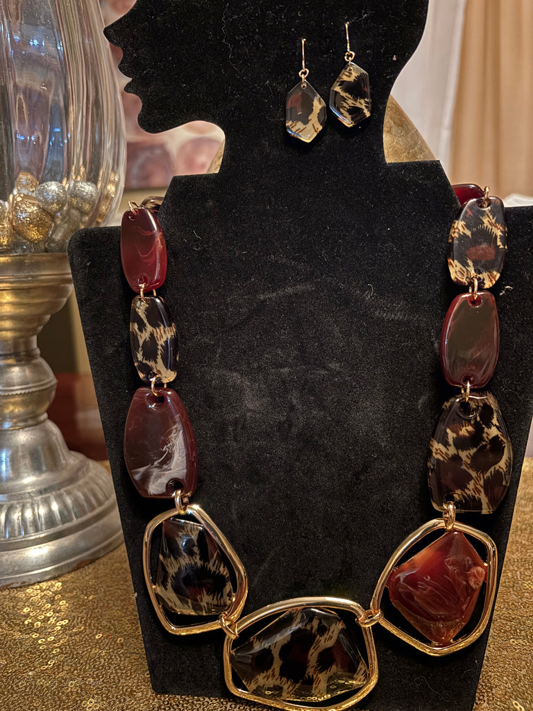ACRYLIC ANIMAL PRINT NECKLACE SET WITH MATCHING EARRINGS.
